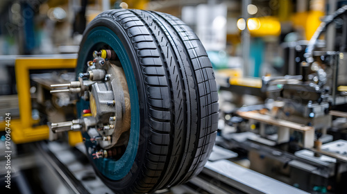 tire, wheel, assembly, manufacturing, production, factory, industry, machinery, equipment, rubber, black, blue, metal, steel, automotive, transportation, technology, process, detail, closeup, engineering, mechanical, automated, part, vehicle, construction, texture, pattern, industrial, workshop, line, belt, sharpened, object, component, modern, new, design, structure, system, working, inside, indoor, precision