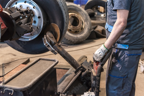 Tire workshop operator who uses a machine to mount or remove a truck wheel.
