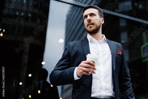 Tired businessman in classical suit with coffee to go and smartphone looking away walking in street in downtown