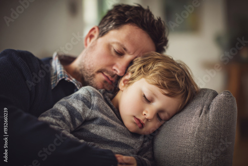 tired dad gently cradling sleeping toddler on armchair, soft diffused daylight, cozy neutral living room, vertical framing