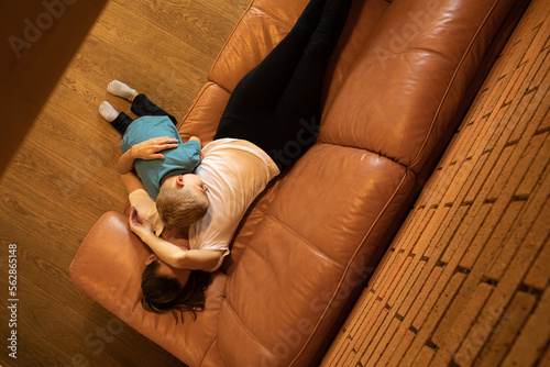 Tired exhausted single mother at home taking care of child