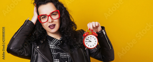 background, clock, hipster, woman, goggles, isolated, funny, time, designer, portrait, unhappy, fashion, make-up, curly hair, cute, excited, expression, european, face, fashionable, model, modern, style, stylish, hairdresser, urban, vintage, wear, young, leather jacket, clothing, work, men at work, alarmclock, yellow background, holding, trendy, unusual, lifestyle, cosmetic, timer