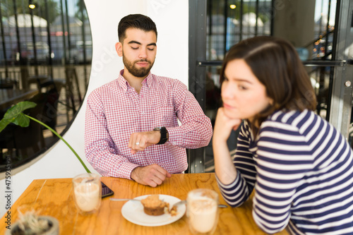 woman, man, 20s, caucasian, young adult, adult, couple, dating, date, boyfriend, girlfriend, partner, cafes, cafes, eatery, table, love, people, lifestyle, talking, bored, boring, sleepy, flirting, angry, upset, fail, annoyed, casual attire, drinking, hot drink, latte, day, beautiful, attractive