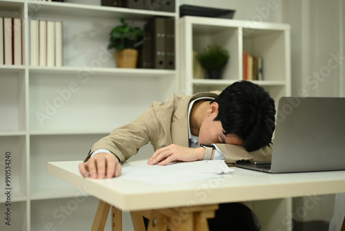 Tired young businessman sleeping at his office desk full of documents and laptop