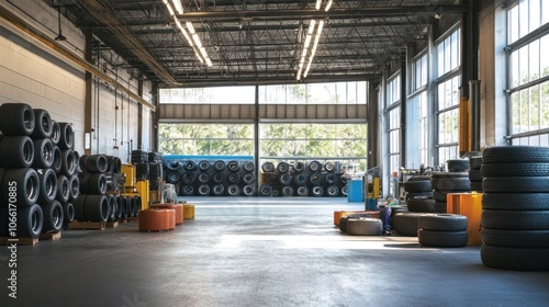 tire, warehouse, industrial, storage, factory, stacked, black, rubber, steel, wheel, building, workplace, interior, garage, machinery, metal, manufacturing, industry, construction, automotive, workshop, business, large, structure, distribution, logistic, space, inventory, product, material, floor, beam, concrete, lighting, ceiling, window, glasses, light, daylight, exterior, bright, grey, shadow