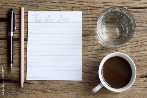 list, to do, hot drink, cup, crayons, pen, checklist, write, copy space, diary, wooden, wood, table, drinking water, water, glasses, mug, topview, background, personal, organiser, blank, check, paper, plan, writing, business, concept, tied-up, memo