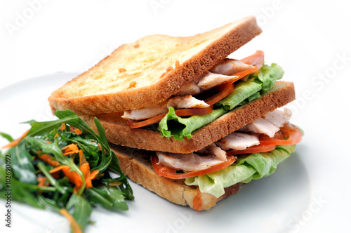 toast with chicken, tomatoes, lettuce and arugula salad on white plate, isolated on white background