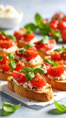 Toasted bread topped with creamy cheese, roasted cherry tomatoes, and fresh basil (1)