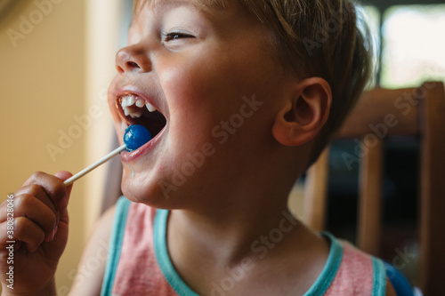 Toddler boy laughing and enjoying lolipop at table wearing tanktop