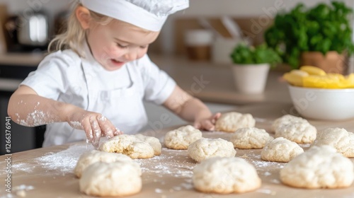 Toddler chef baking cookies in kitchen