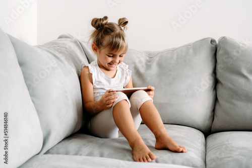 Toddler girl playing with digital wireless tablet computer on couch at home. Baby child growing with online applications. Portrait of toddler with smartphone. Education and learning concept.