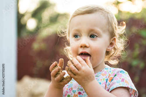 Toddler girl tasting sand from her dirty hands
