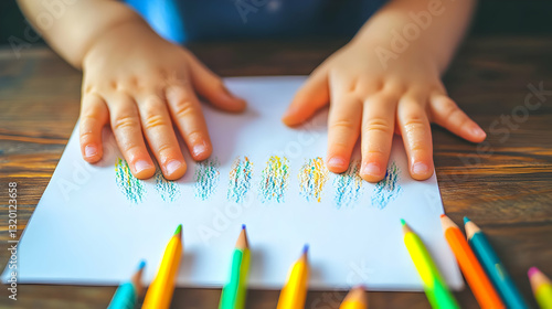 Toddler's Colorful Crayon Strokes on Paper, a Close-Up View of Creative Child's Artwork, Early Development and Artistic Expression, Showing Hands and Bright Colors.