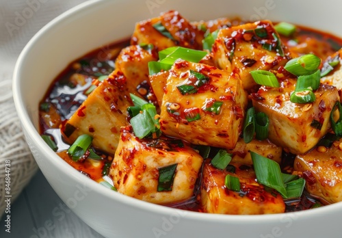 Tofu meal, spicy food. Asian vegetable salad in bowl. Chinese healthy delicious gourmet. Tasty traditional japanese or thai cooking. Fried dinner or lunch in dish