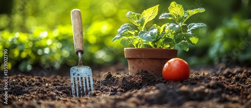 Tomato plant with ripe and unripe fruit growing in garden bed beside gardening tools under full sunlight showing crop transition and seasonal farming cultivation