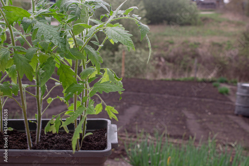 Tomato seedlings in a plastic container. Green tomato seedlings on the background of a vegetable garden.