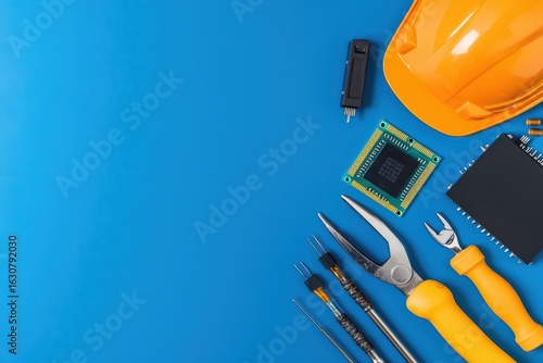 tool, safety, gear, electronic, repair, maintenance, hard hat, screwdriver, plier, circuit board, microchip, drill, wrench, soldering iron, workbench, workshop, technician, hobbyist, industry, equipment, construction, repairman, device, innovation, technology, component, professional