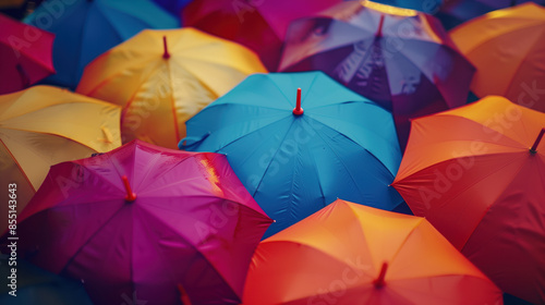 Top down view of colorful umbrellas in the rain. Background image. Created with Generative AI technology.