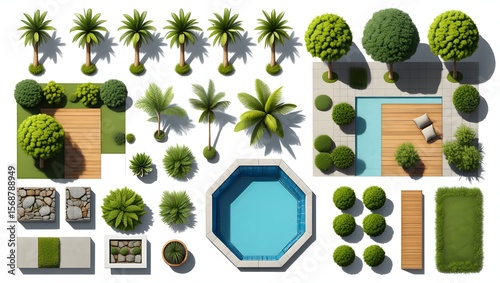landscaping, garden design, pool, swimming pool, palm tree, tree, bush, shrub, decking, lawn, garden, landscape architecture, aerial view, landscape design, backyard, greenery, visualisation, lush, landscaped, patio, deck, foliage, topiary, yard, recreation, botanical, plant