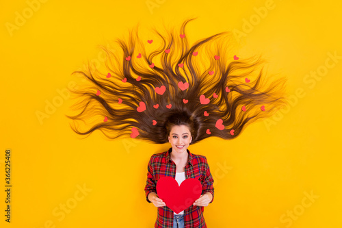 Top view above high angle flat lay flatlay lie concept of nice attractive glad kind affectionate long-haired girl many hearts in hands curls isolated bright vivid shine vibrant yellow color background