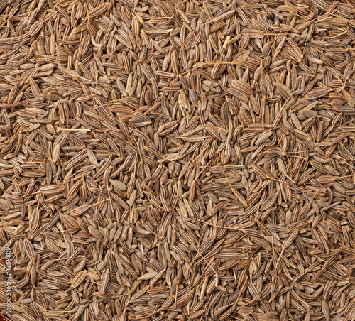 Top view, closeup of cumin seeds. Food backdrop