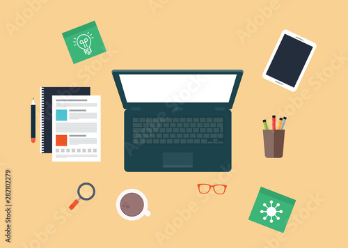 Top view elements. Desk background with laptop, digital devices, office objects, books and documents