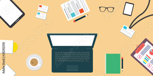 Top view elements. Desk background with laptop, digital devices, office objects, books and documents