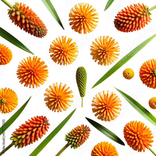 Top View Flat Lay of Scattered Kniphofia Petals and Leaves, Artistic Botanical Composition, Transparent Background