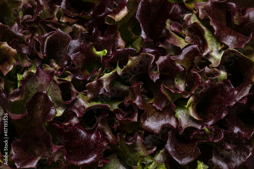 Top view full frame macro shot of red leaf lettuce aka lollo rosso.