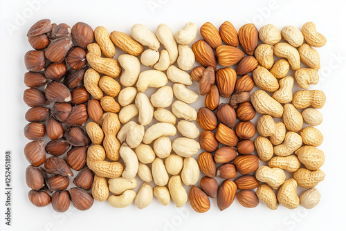 Top view group of mixed nuts isolated on white background, Selective focus varies of mixed nut on white, Close up shot grains and nuts.