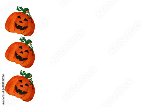 Top view of 3 felt pumpkins on a white background. Halloween holiday background. Copy space