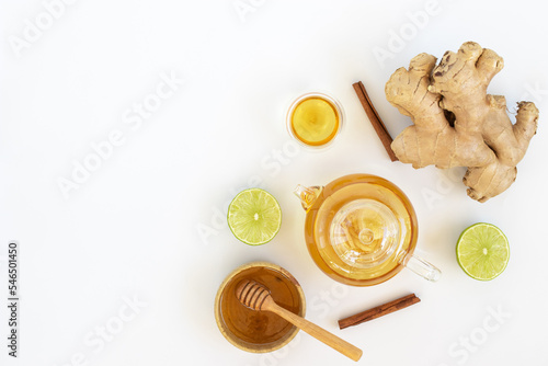 Top view of a cup of tea with ginger root, lime, cinnamon and teapot on white background. Health drink concept.