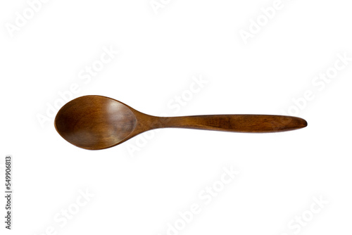 Top view of a dark wooden spoon on an insulated white background