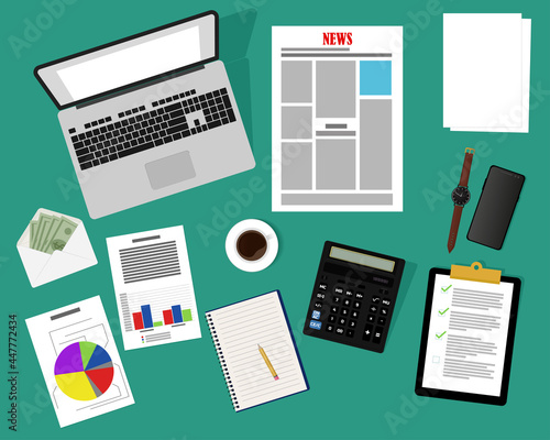 Top view of a desk with a computer, notepad, resumes, documents, charts, reports, smartphone, pencil, calculator, coffee, newspaper. Vector illustration in flat style. Template for business