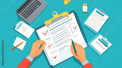 checklist, clipboard, top, view, person, filling, out, document, laptop, crayons, pill, bottle, turquoise, desk, office, work, task, complete, check, mark, paper, form, hand, business, organisation, management, planning, schedule, efficiency, productivity, process, blue, green, grey, white, yellow, red, flat, illustration