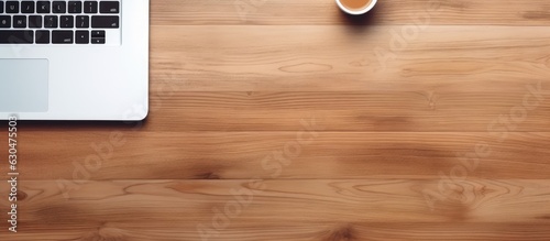 Top view of a wooden office desk with a smartphone showing a blank screen, a laptop computer, a cup of coffee, and supplies. is a flat lay with copy space.