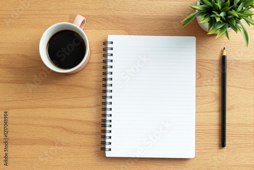 Top view of blank notebook with pencil, coffee cup, and plant on wooden desk.
