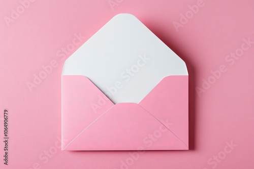 Top view of blank paper card in an open pink envelope. 3d love letter isolated on pink background, with generative ai