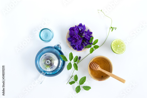 Top view of Butterfly pea flower tea with lemons on white background. Health drink concept.
