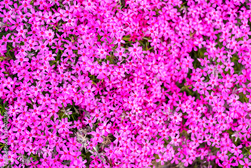 Top view of carpet from beautiful little flowers in violet color. Beauty of nature in spring bloom.