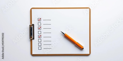 Top view of clipboard with checklist, checkboxes, pen, and check marks on white background, tick, white