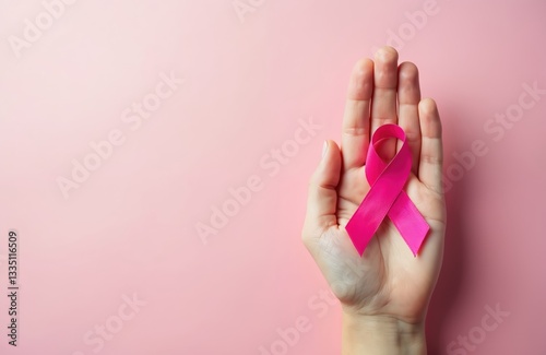 Top view of female hand holding pink ribbon as breast cancer awareness symbol. Isolated pastel pink background with copy space. Healthcare campaign, support for oncological disease. Satin ribbon bow