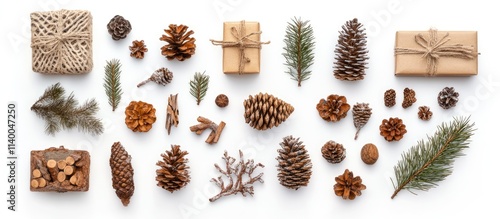 Top view of gift boxes pine cones and natural decorations on a white background for festive or seasonal design concepts