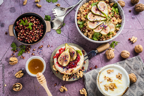 top view of gourmet dish with Figs fruits, nuts, honey, couscous and pomegranate seeds on table