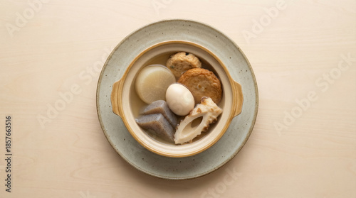 Top View of Japanese Oden in Ceramic Bowl
