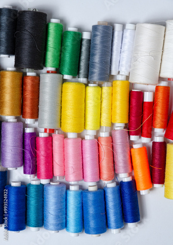 Top view of many colorful thread spools background