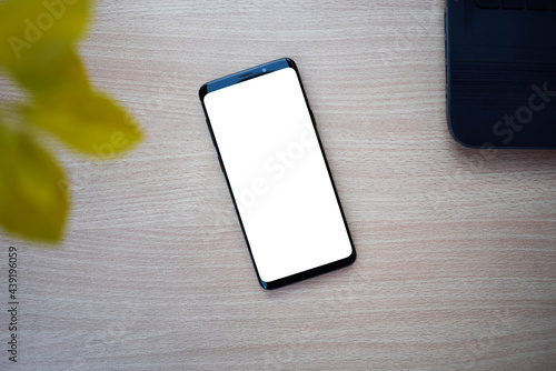 Top view of mobile phone with blank screen for text on wooden desk. Mock up
