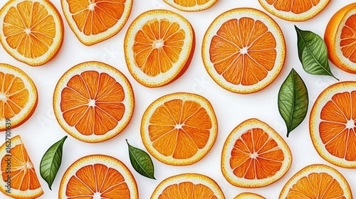 Top view of multiple orange slices and green leaves scattered on a white background, displaying vibrant colors and fresh appearance