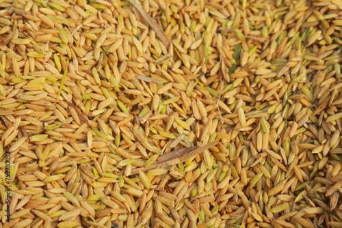 Top view of paddy rice or rice seed on background. Yellow paddy jasmine rice for background.