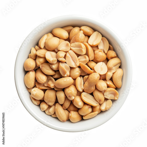Top view of roasted shelled peanuts in a white ceramic bowl, healthy snack and natural protein source, isolated on transparent background.
